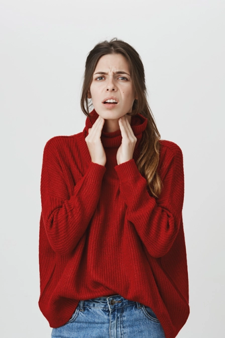 • Появляется ощущение комка в горле, иногда — затруднение дыхания.